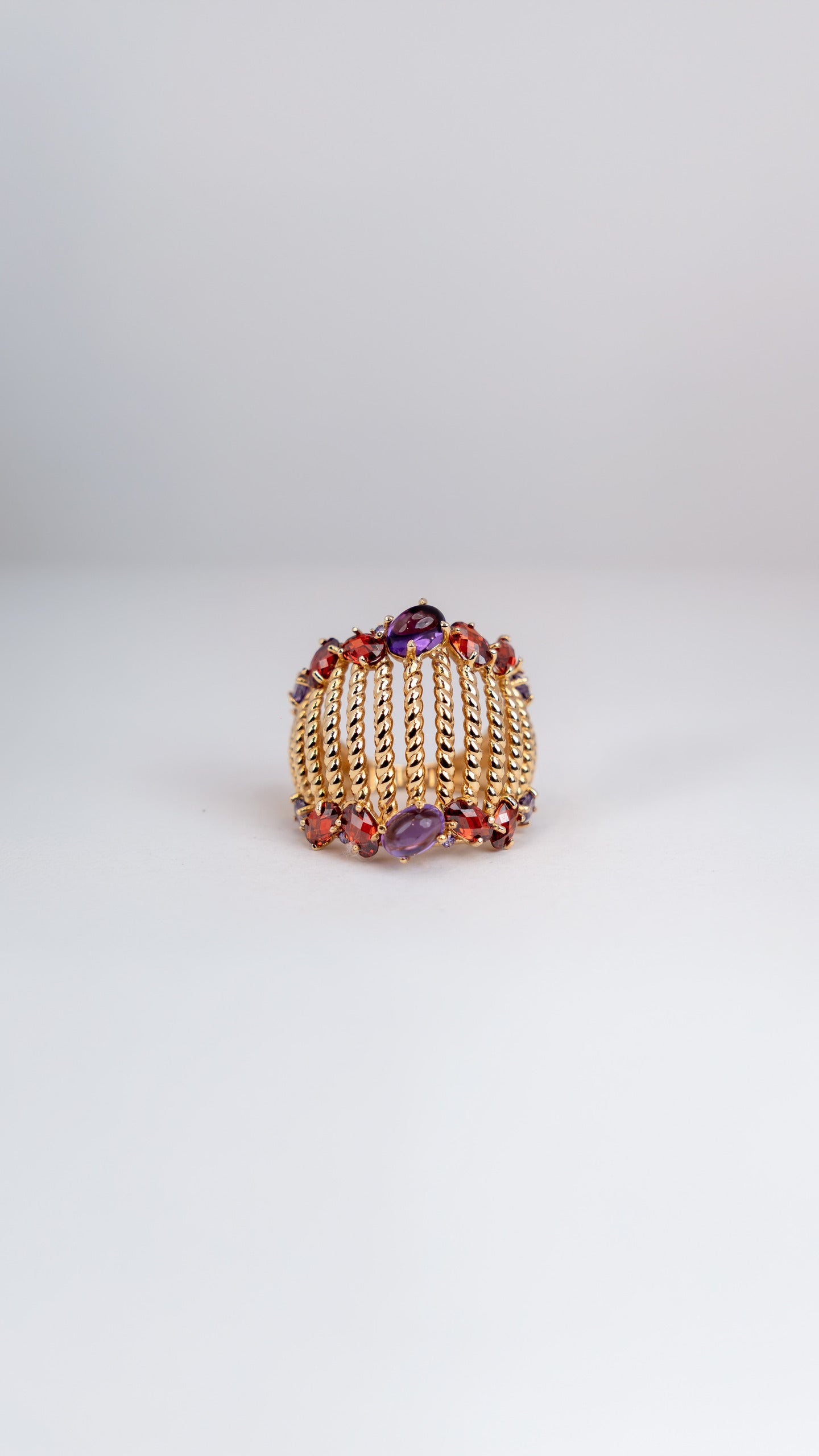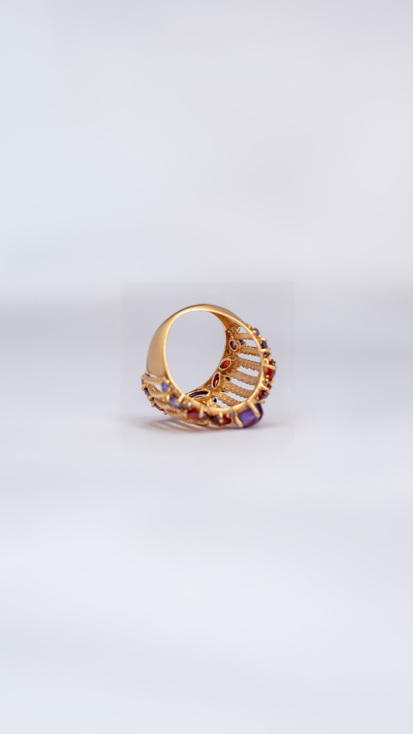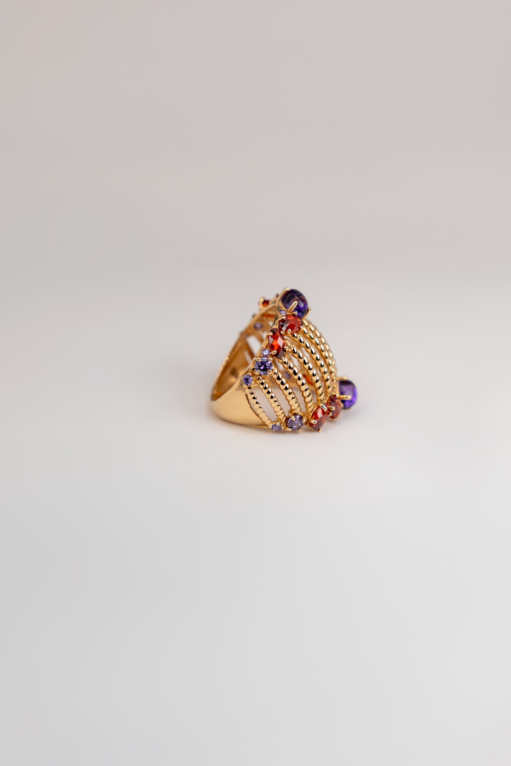 This Aurora ring that wraps beautifully around the finger. It is set with colorful gemstones in different shapes and sizes. The mix of purple and red stones adds a rich, elegant touch.