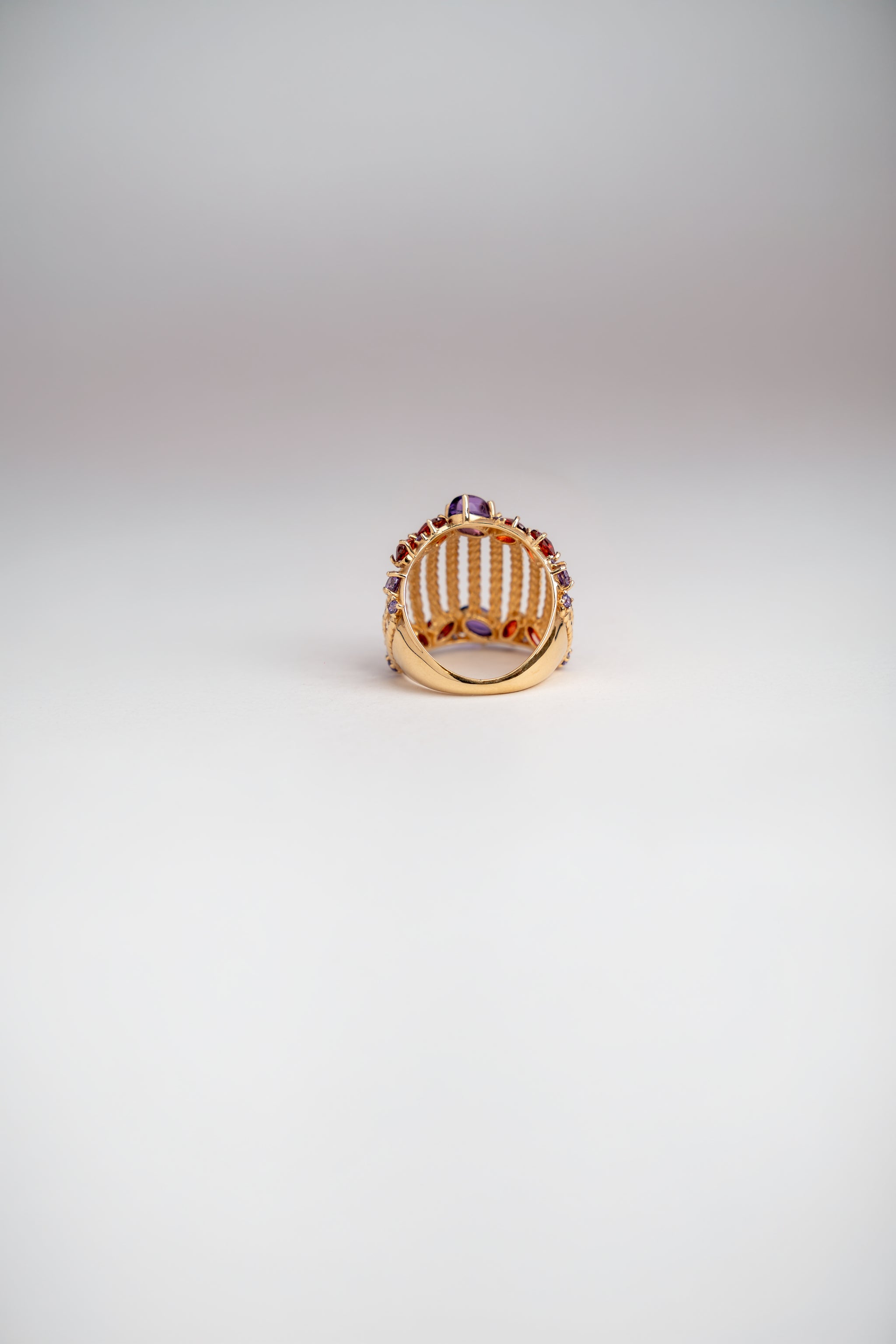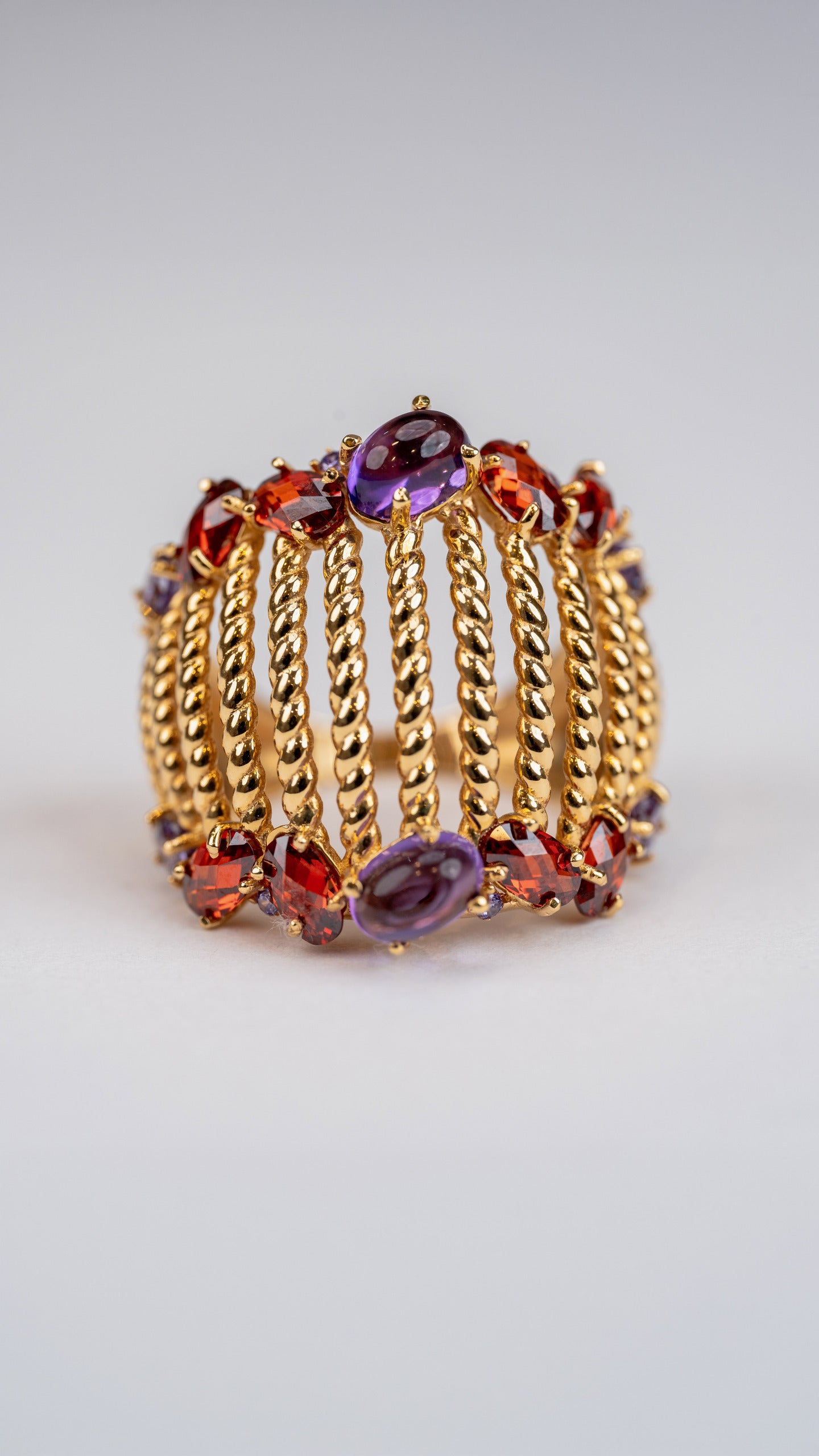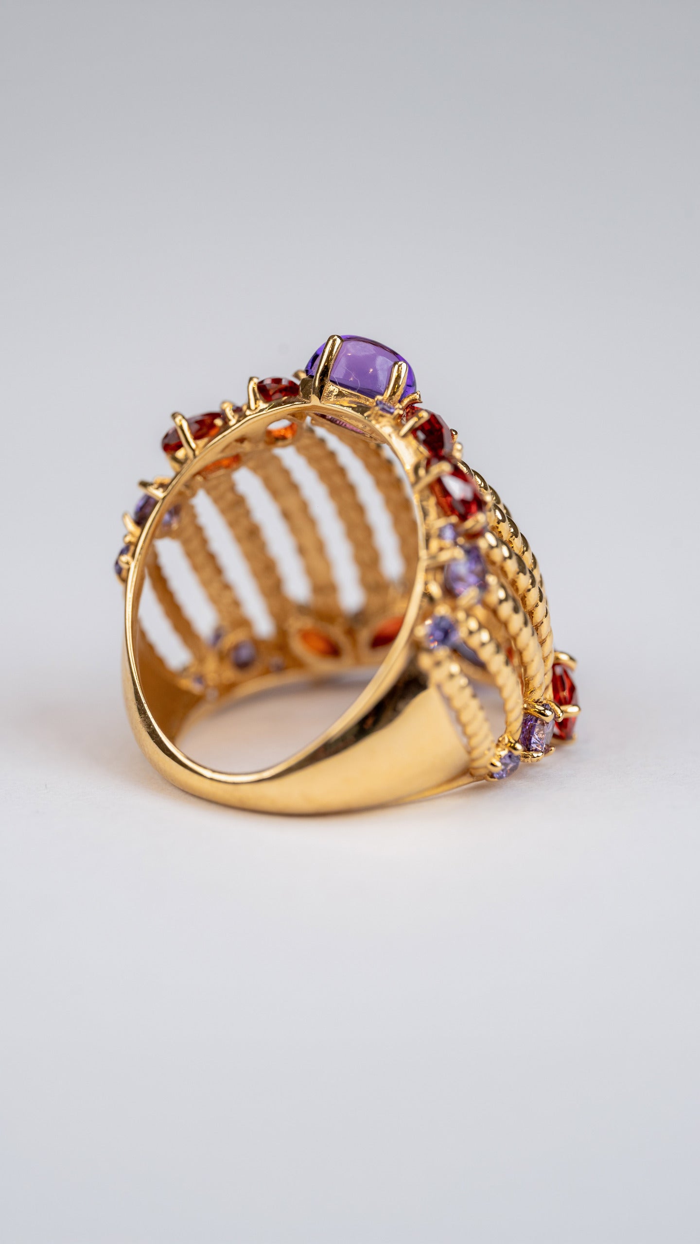 This Aurora ring that wraps beautifully around the finger. It is set with colorful gemstones in different shapes and sizes. The mix of purple and red stones adds a rich, elegant touch.