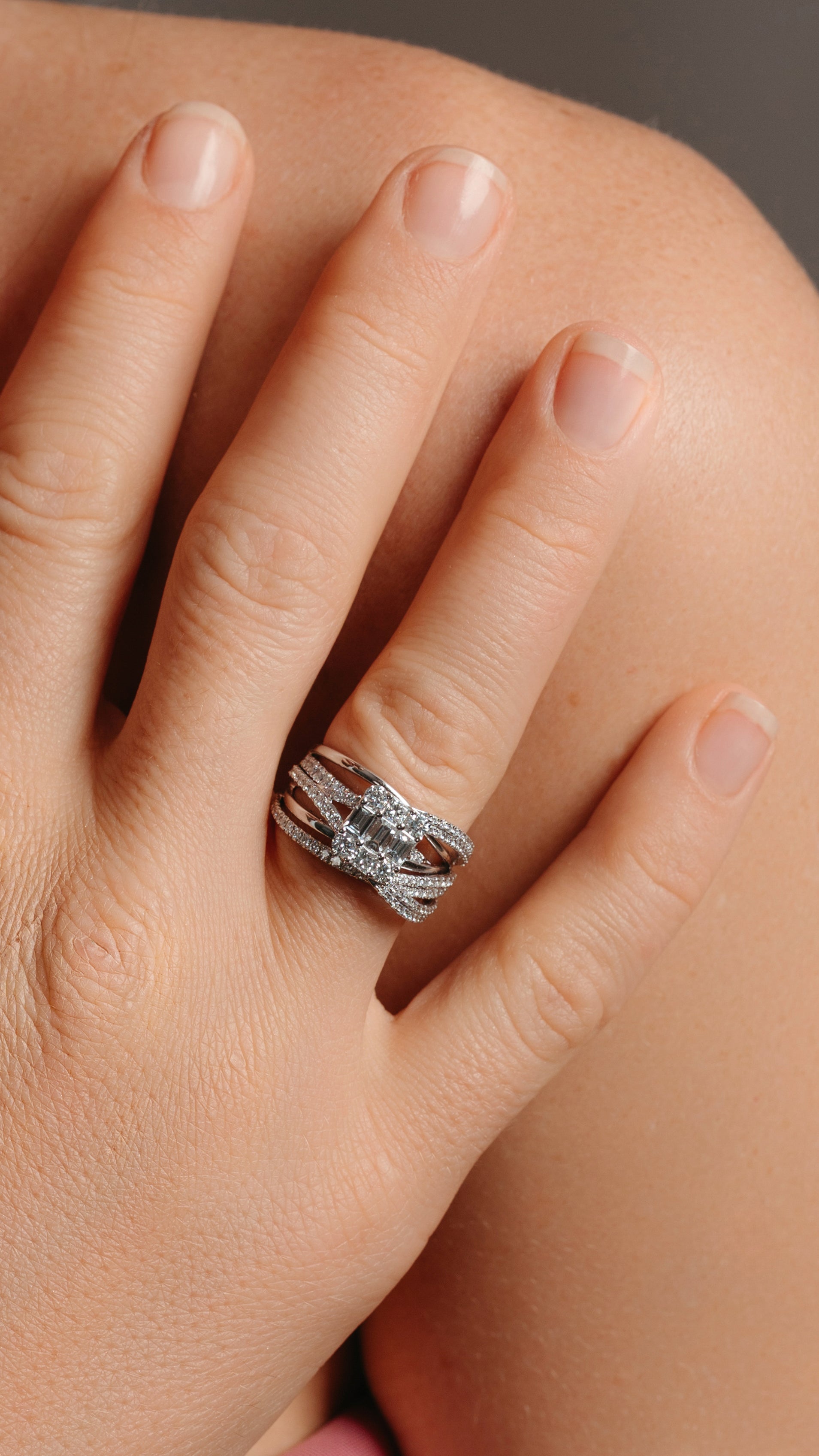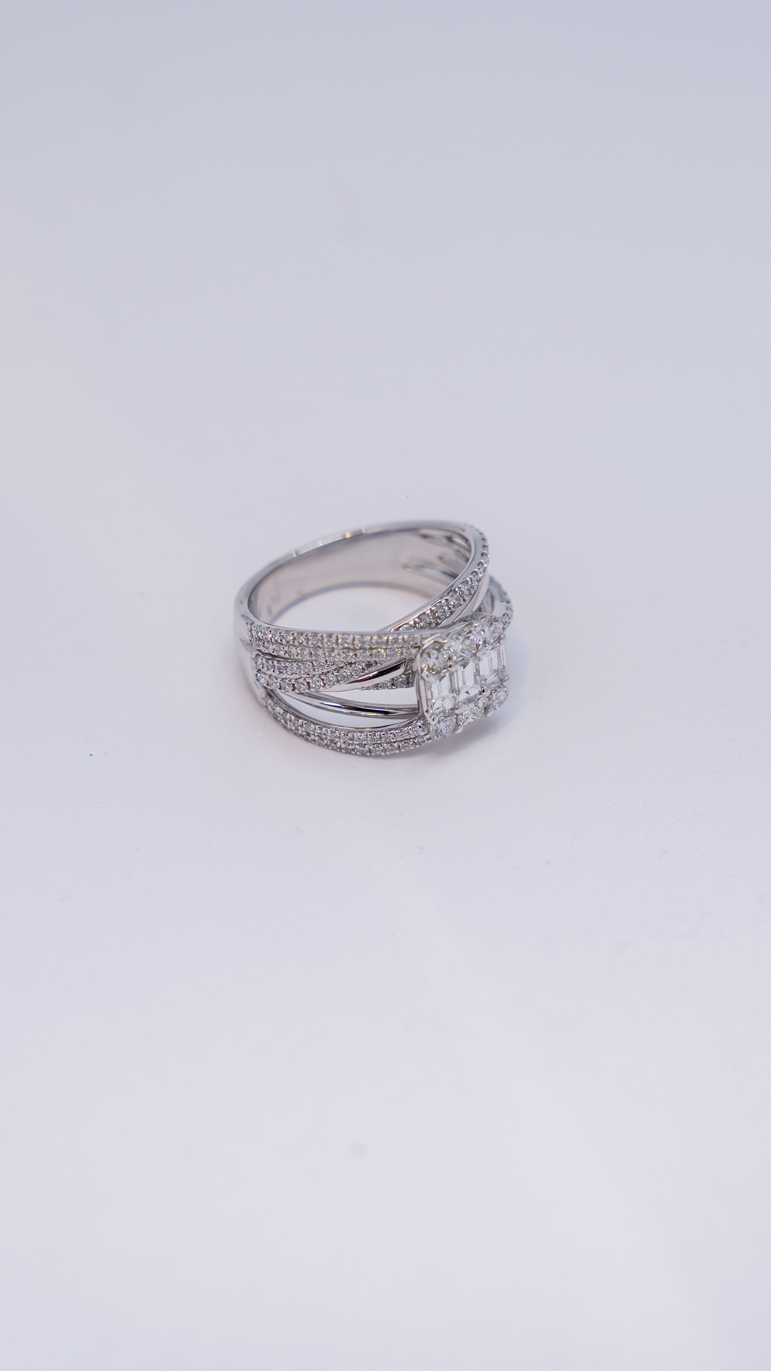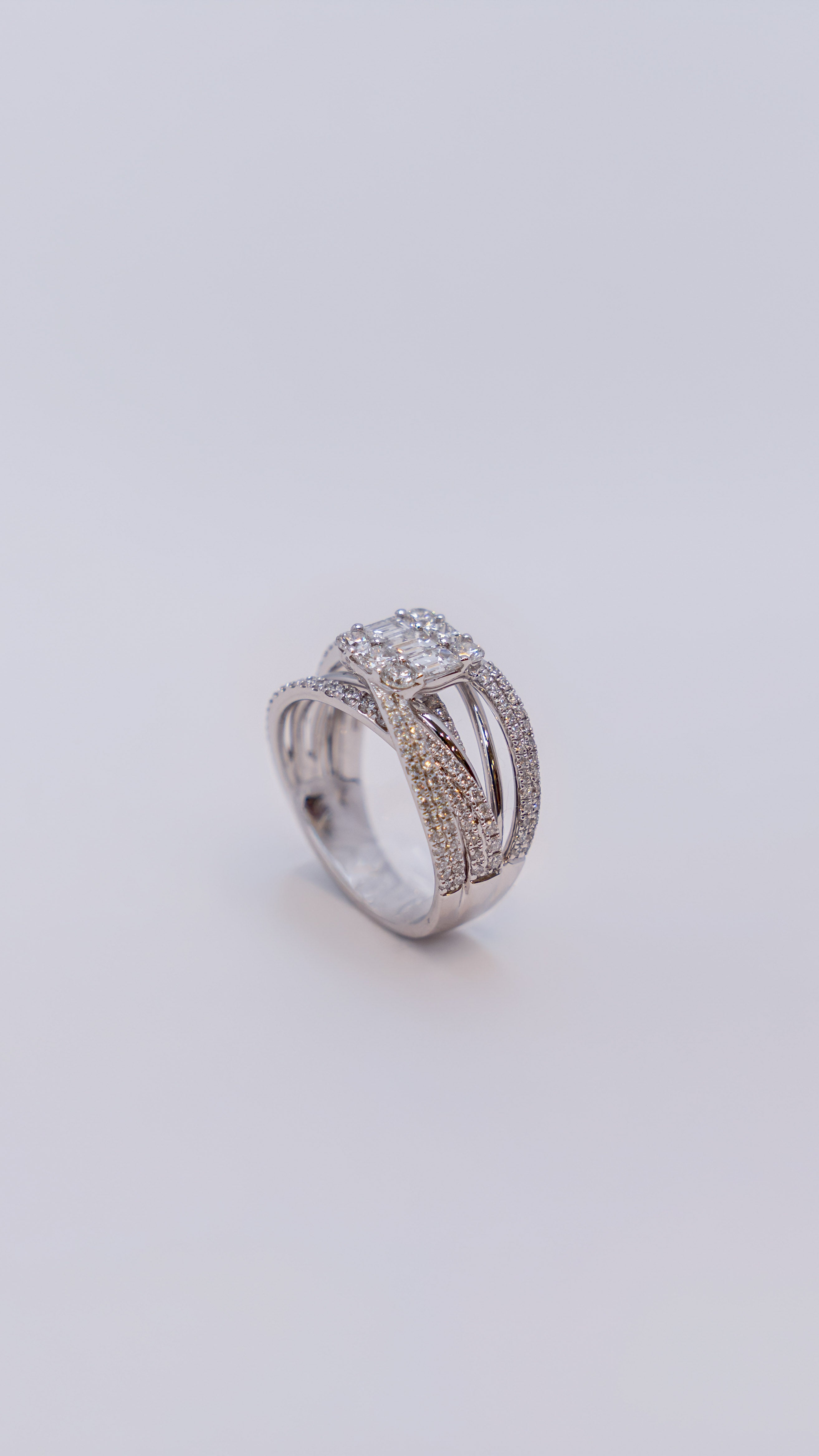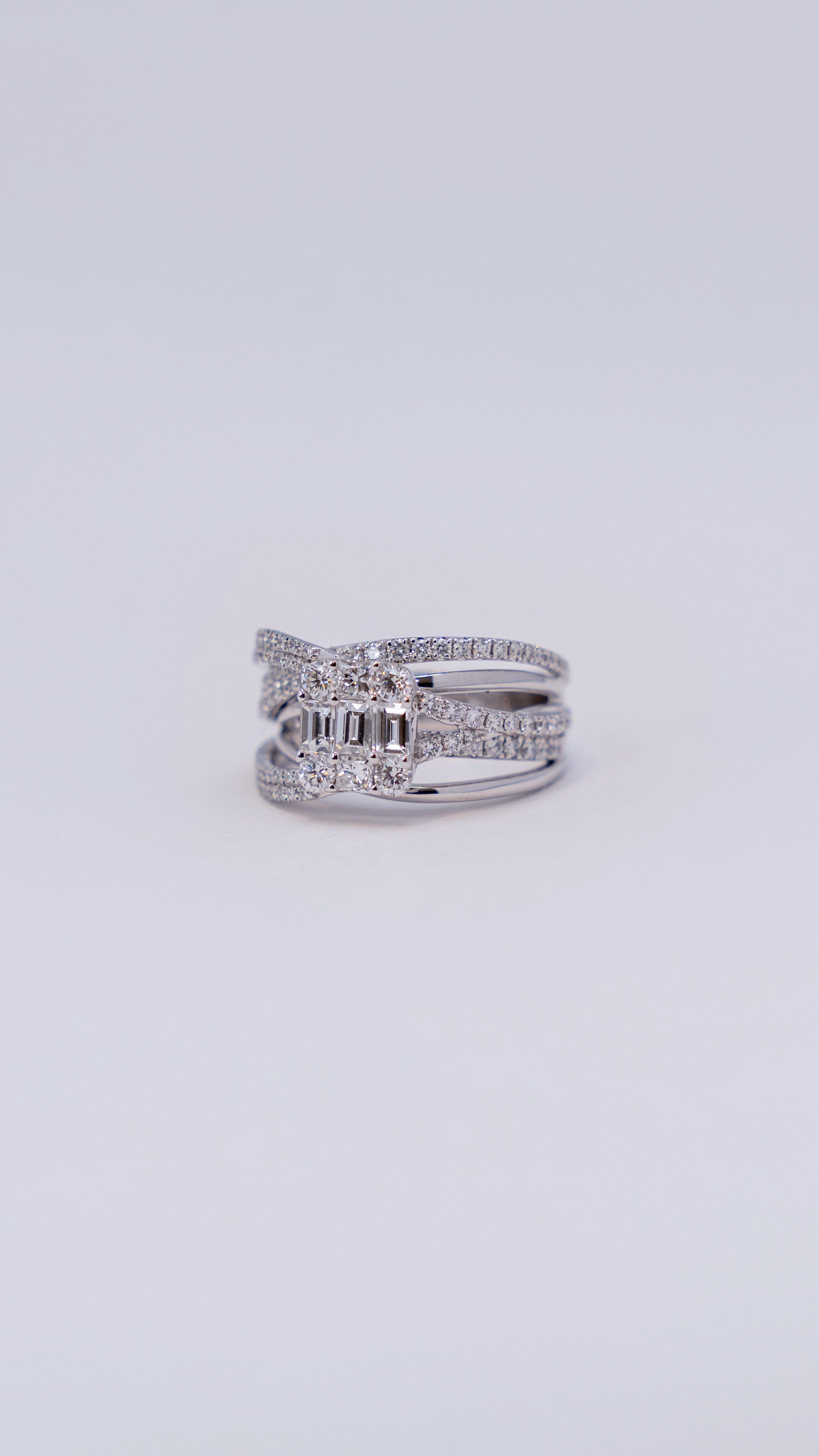 This 18k white gold ring features a central cluster of brilliant round cut diamonds, creating intense sparkle. Adorned with baguette cut diamonds along the band.