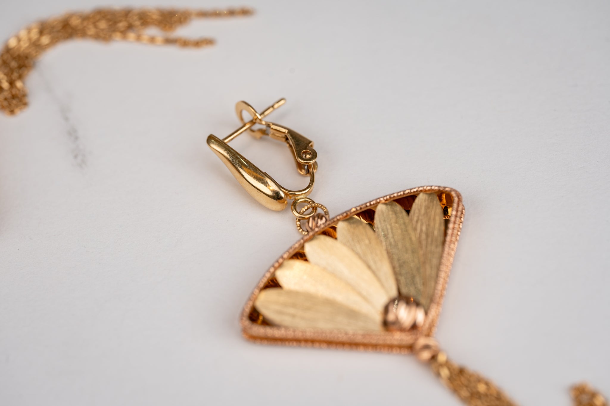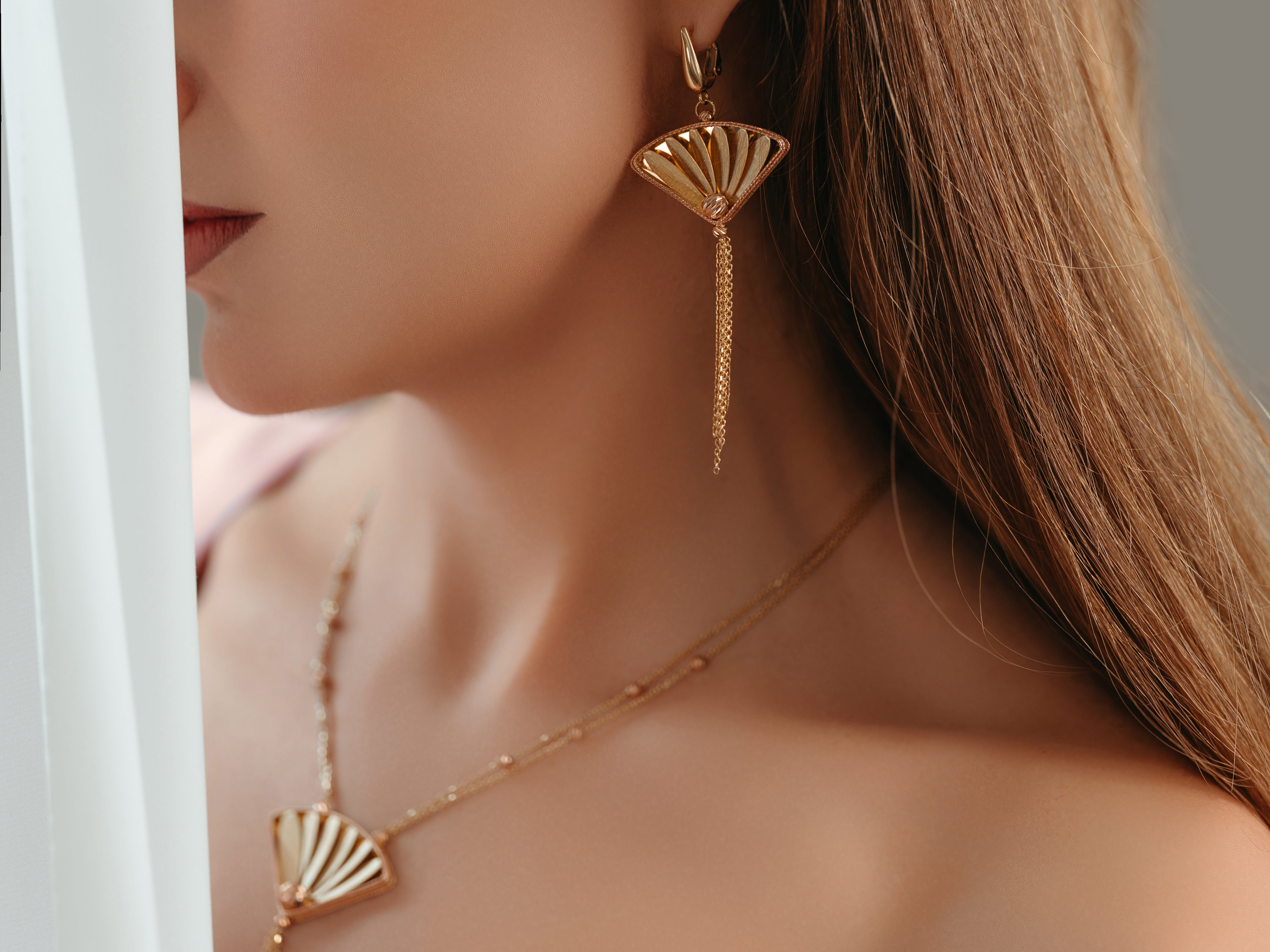 This elegant 18k gold earring features a sophisticated fan shaped pendant with a cascading tassel. Its unique design brings high-fashion glamour to any look.